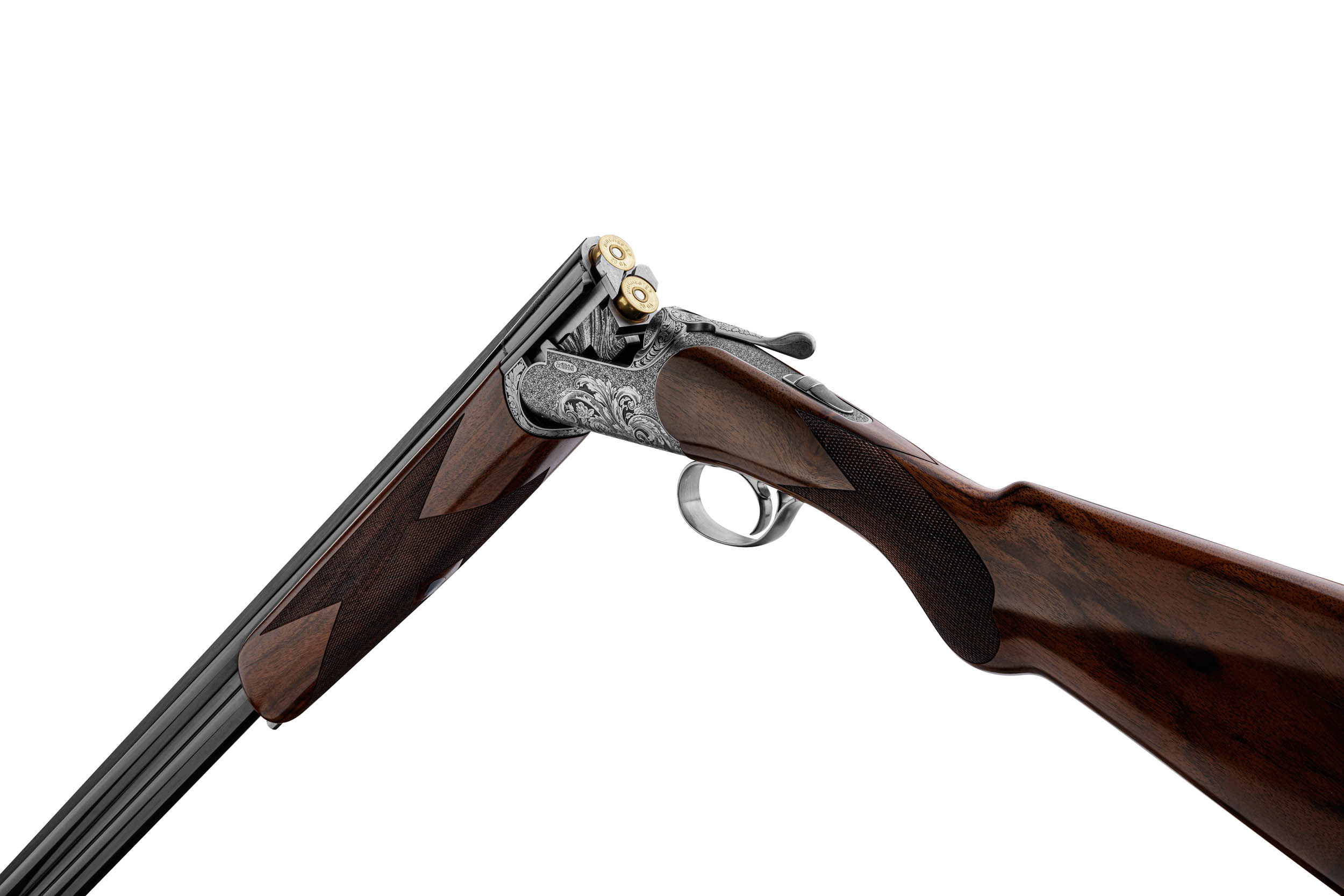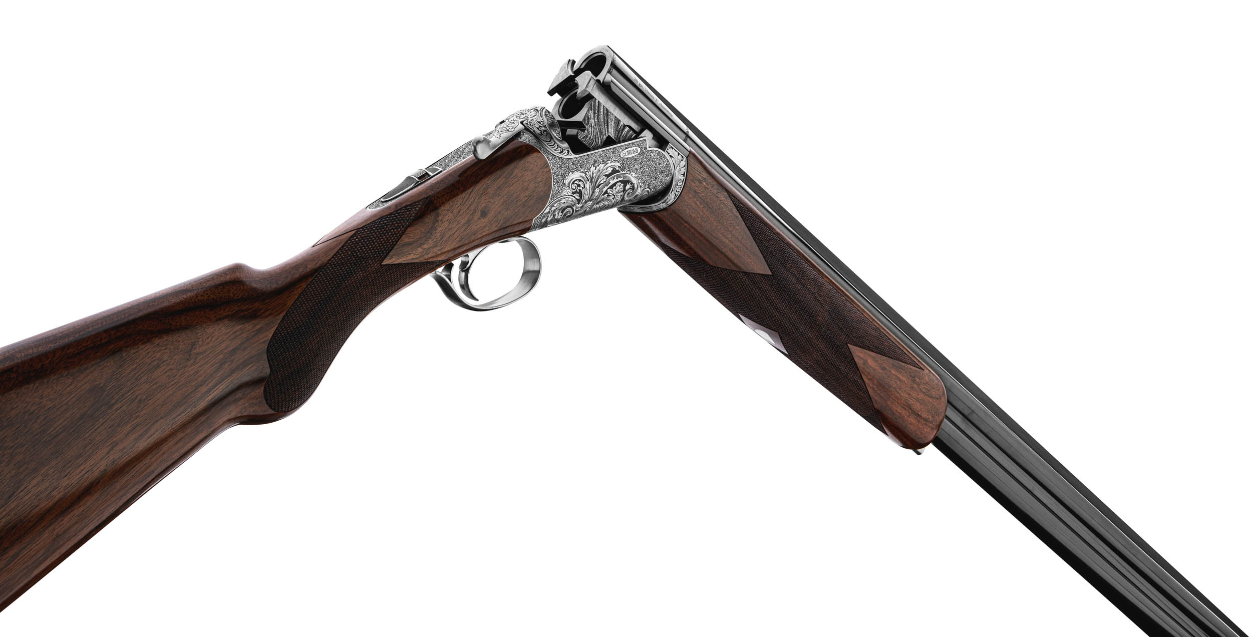 La gamme Ellipse de Caesar Guerini, fusil de chasse superposé, se distingue par sa bascule ronde en Ergal et ses gravures luxueuses.