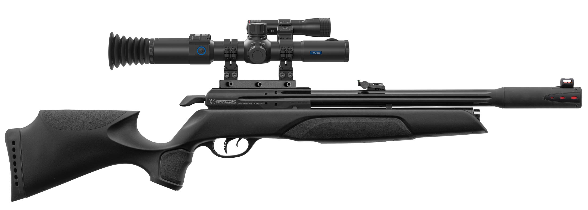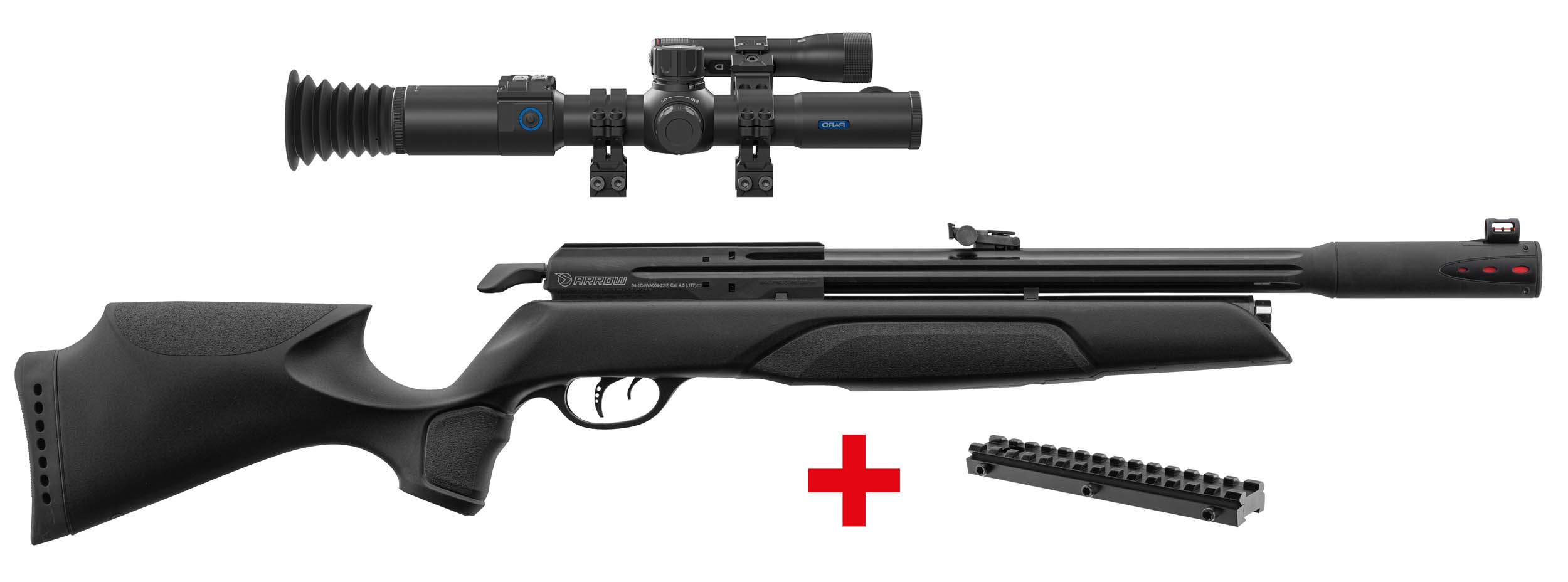 Un pack idéal pour le tir de jour comme de nuit grâce à la lunette de vision nocturne PARD et la lampe infrarouge PARD qui complètent la carabine PCP Gamo Arrow équipée d'un réducteur de son.