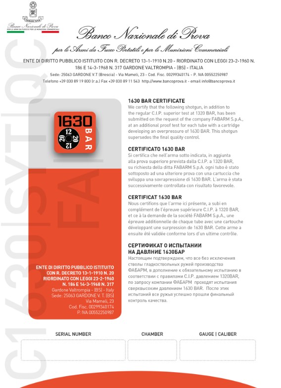 FABARM est le seul fabricant ayant conclu avec le banc C.I.P d’épreuves de Gardone Val Trompia un protocole de test à 1630 BAR. Chaque fusil FABARM concerné par cette épreuve exclusive ( le test C.I.P. légal prévoit une pression de seulement 1320 BAR ) est livré avec un certificat d’épreuve 1630 BAR. La sécurité de nos clients est notre priorité absolue.