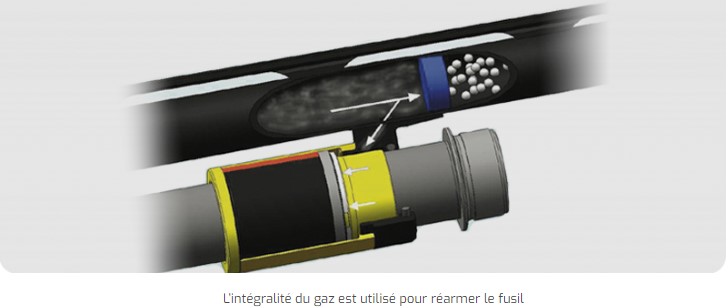 Un piston avec un insert flexible en polymère pour réguler le réarmement : il travaille tel un frein progressif à l’intérieur du cylindre de gaz. Plus de valve et la possibilité, plus que jamais, de tirer tous les types de cartouches avec une incroyable réduction du recul.