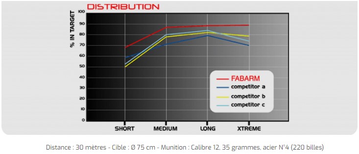 Le fait de pouvoir utiliser des chokes plus fermés que le demi-choke est un avantage essentiel pour le chasseur. Ainsi lorsque les canons concurrents ont un rendement moyen de 76 % avec son choke ½, le tir de la même cartouche avec le choke FABARM INNER HP XTREME (0,9) permet un rendement de 89 %.