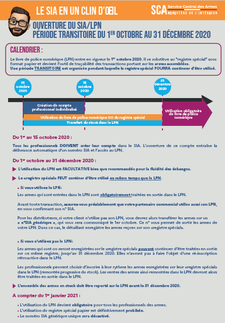- A partir du 15 octobre, plus aucun grossiste ne pourra vendre d’arme à un établissement sans connaitre son n° SIA. Pour le reste de la procédure applicable entre le 1er octobre 2020 et le 31 décembre 2020, je vous invite à consulter les deux documents ci-dessous.